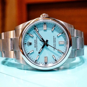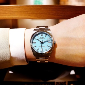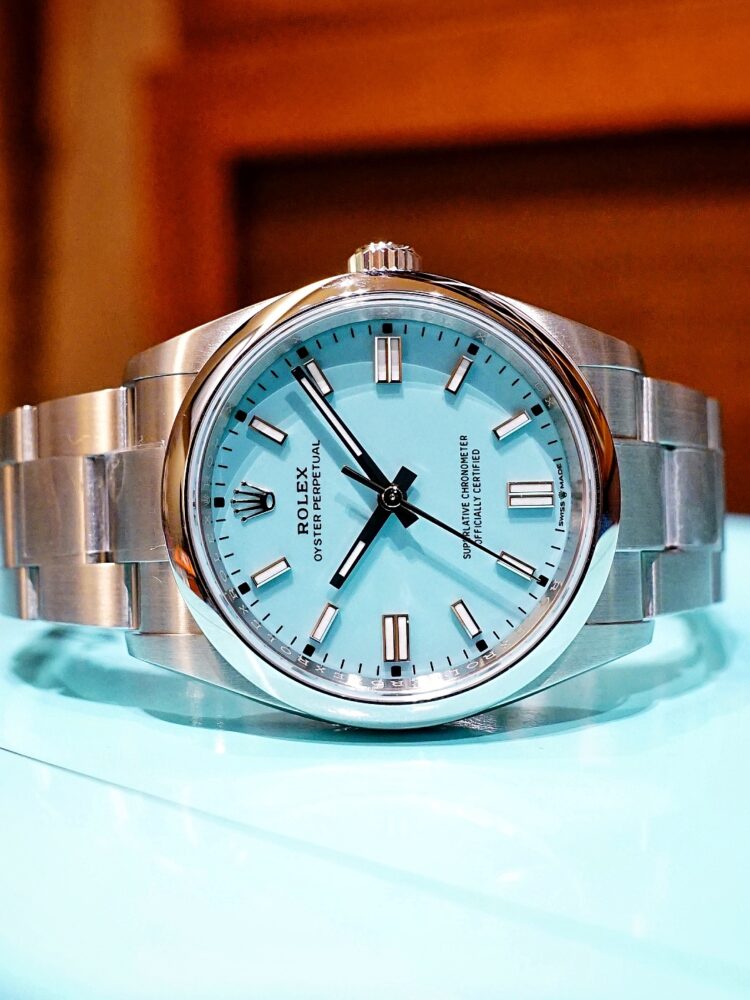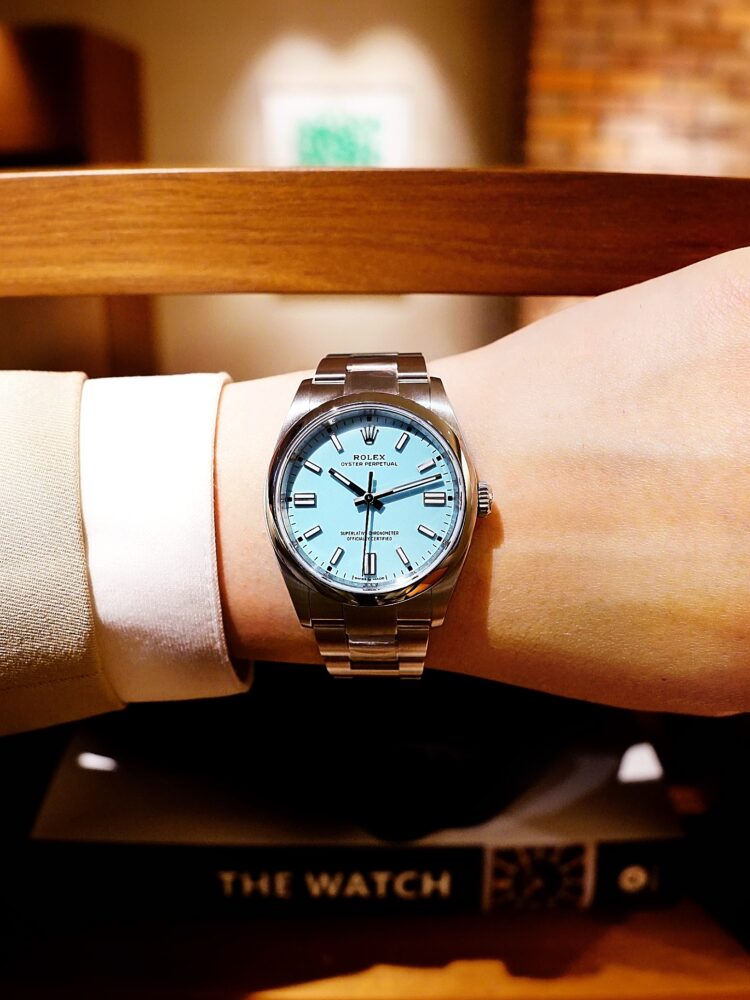 オイスターパーペチュアルの中で、頭ひとつ抜きん出ている人気のターコイズブルーダイヤル。