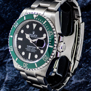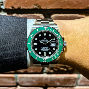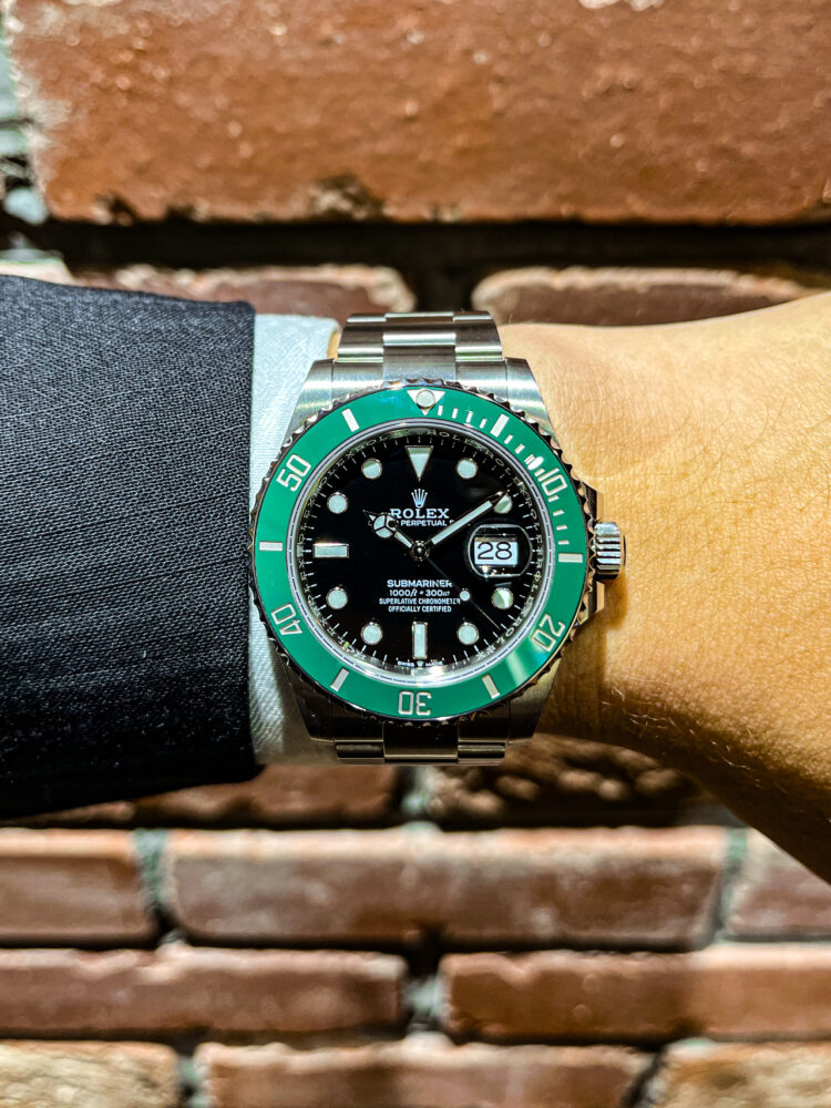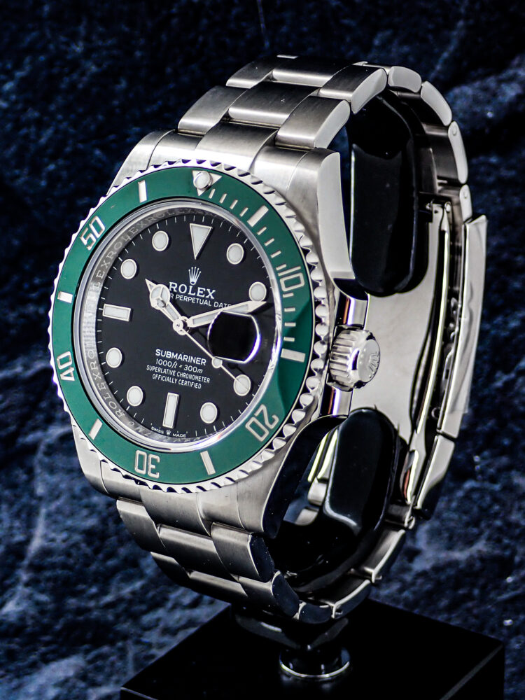 2023年にマイナーチェンジをして、16610LVを彷彿とさせる『ライムグリーン』の様なカラーになりましたが、こちらは2021年式の個体ですので、『エメラルドグリーン』の様な、少し青みがかったベゼルカラーになっております。