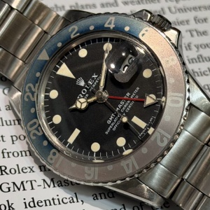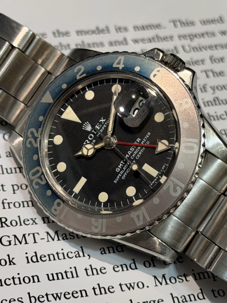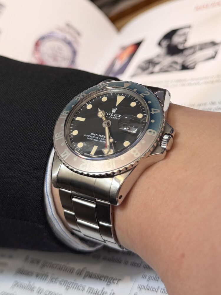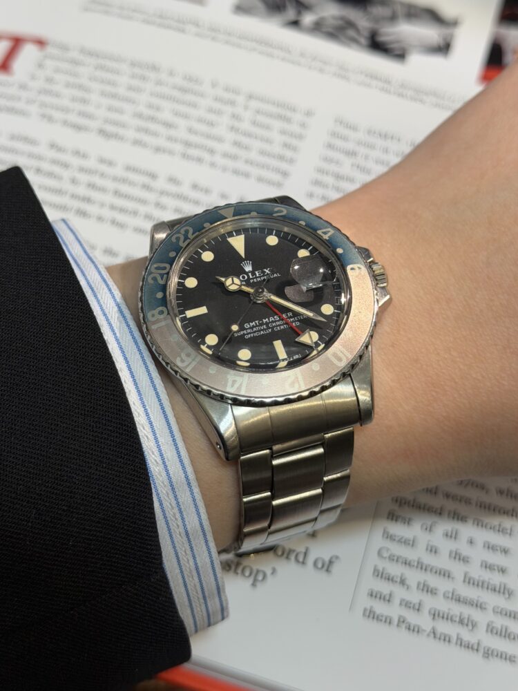 1950〜70年代にかけて製造された名作GMTマスター。現行にはない細身のケースライン、プラスチック風防の柔らかなドーム、そして経年でしか生まれない表情がこのモデル最大の魅力です。