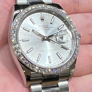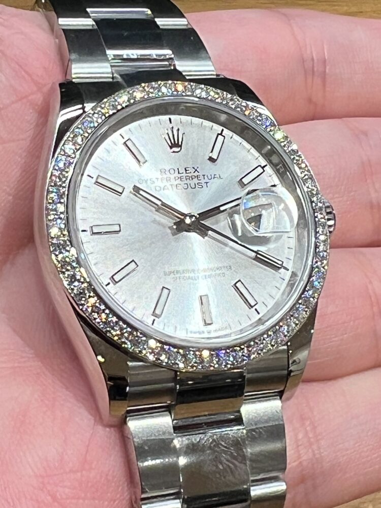 モデルナンバー末の「RBR」はラウンドカットダイヤモンドを意味しており、丸くカットされたダイヤモンドがセッティングされたベゼルは何とも言えない高級感があります。