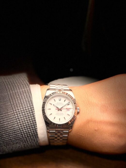 白文字盤に映える赤のアクセントが魅力的なターノグラフ