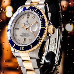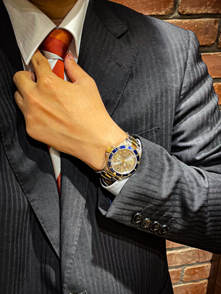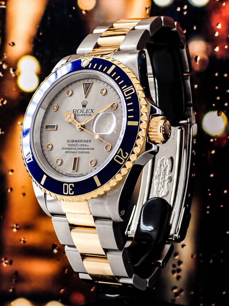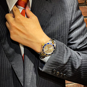 スポーティーなイメージのあるサブマリーナですが、この一本はラグジュアリーな仕様となっております。6・9・12時にブルーサファイア、そして8箇所にダイヤモンドが付いているダイヤルで、個性を表現するのには良い個体だと思います。ブレスは少々伸びておりますが、あまり見かけないお時計ですので、この機会に是非ご検討くださいませ。