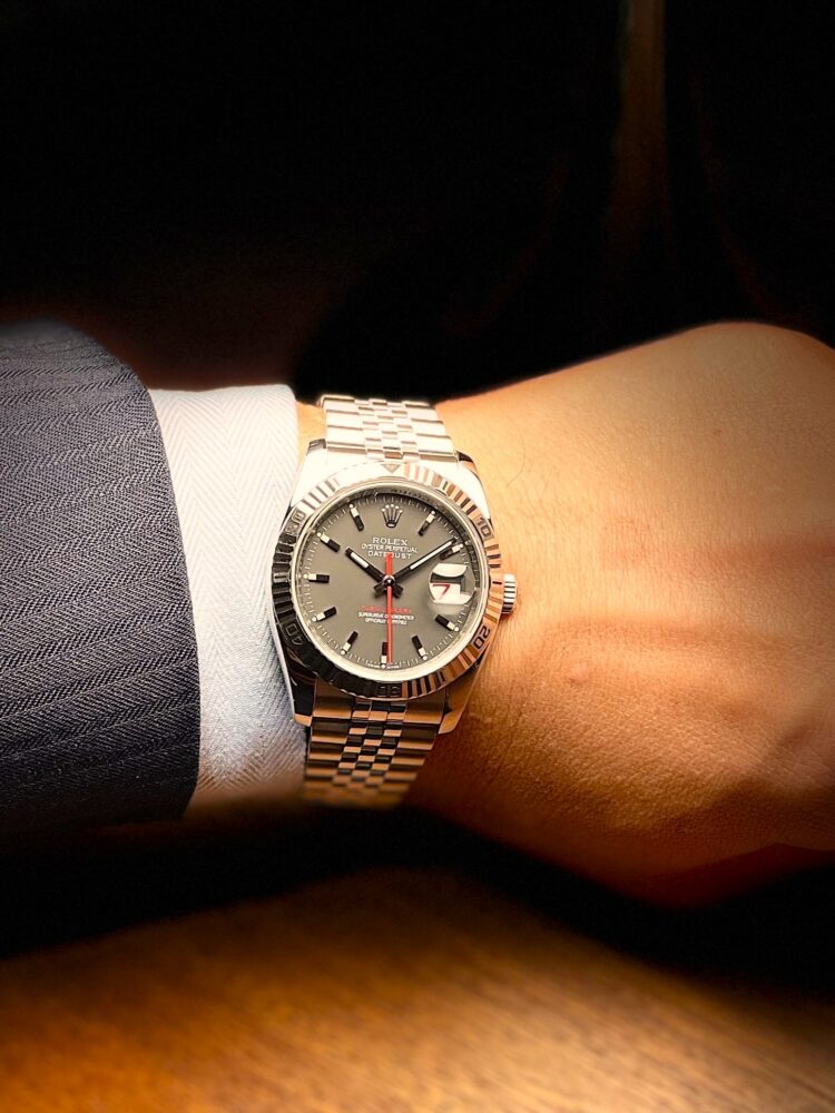 白文字盤に映える赤のアクセントが魅力的なターノグラフ