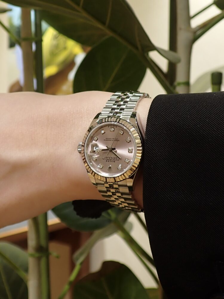 36mm径や41mm径のデイトジャストは、カッコ良さが前面に押し出されていますが、28mm径のデイトジャストは、カッコ良さの中にもどこか可愛らしさがありますね。