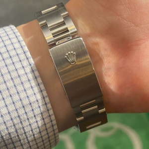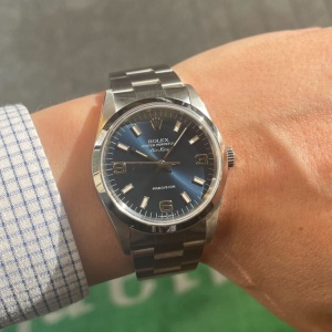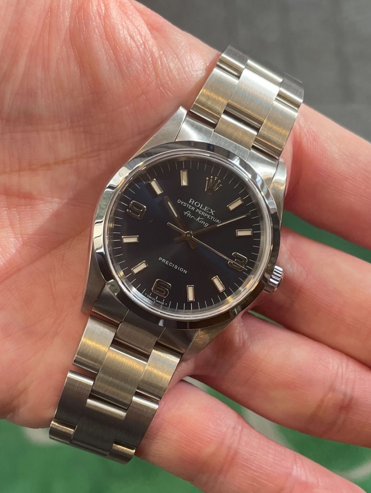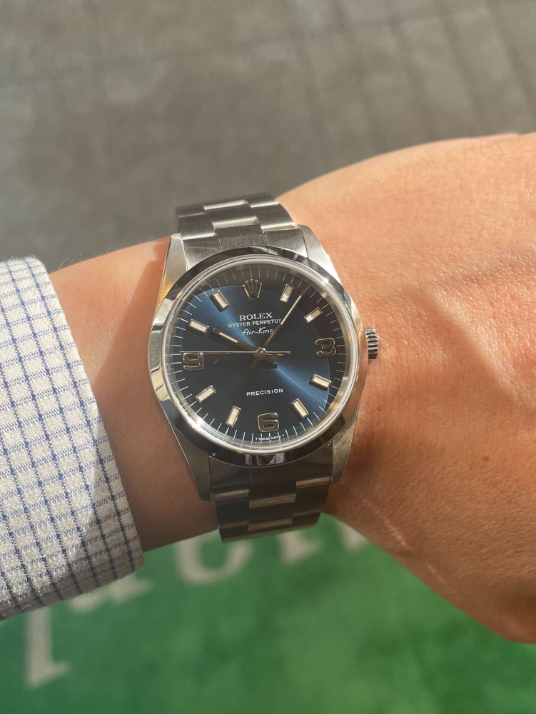 丁度良いサイズ 古賀 エキスパート クォーク仙台店 2025.10.04 ROLEX AIR-KING Ref.14000 Made in 1998 ミニマリズムを感じるモデル 「エアキング Ref.14000」です。 サンレイ仕上げのブルー369ダイヤルは 光の角度によって表情が変わり 美しく輝きます。 シンプルで控えめながらも 確かな存在感を放ち 腕元に静かな気品を 添えてくれているようです。 90年代後期のトリチウム夜光は 焼けがほんのり入っており 雰囲気が良い1本です。 プレミアムモダン エアキング クォーク仙台店 このスタッフへ問い合わせる この商品の詳細はこちら