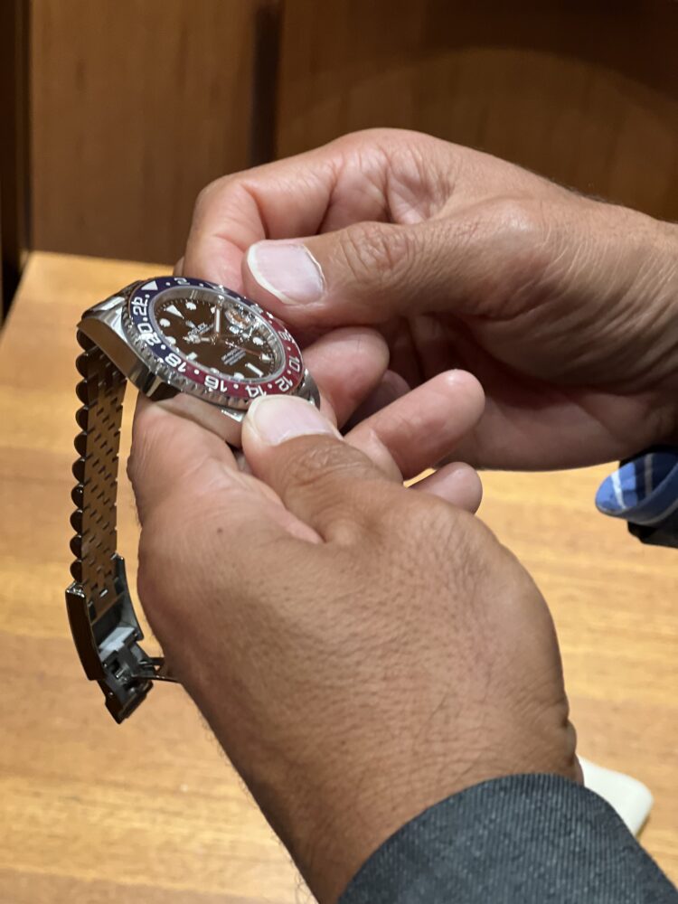 2018年に誕生したGMTマスターII Ref.126710BLROです。新世代ムーヴメントCal.3285を搭載しており70時間のロングパワーリザーブを誇ります。短針が単独で稼働し、24時間針とベゼルを使えば最大3ヵ国の時間を知ることが出来ます。ベゼルカラーはシリーズ最大の人気を誇る赤青です。GMTと言えばこのカラーが好きな方も多いかと思います!