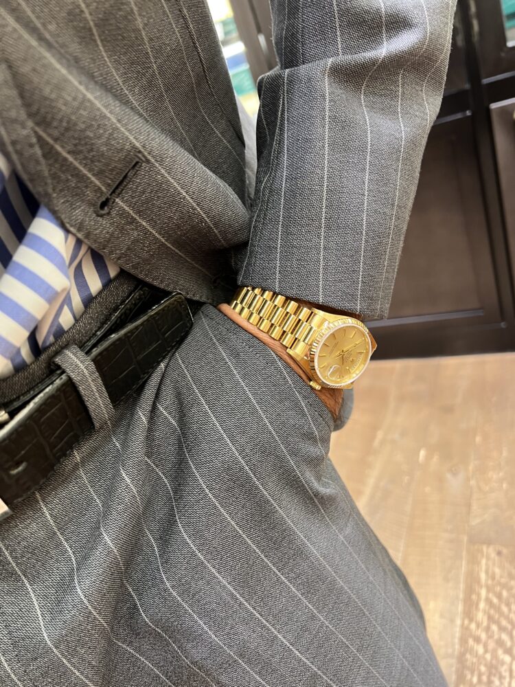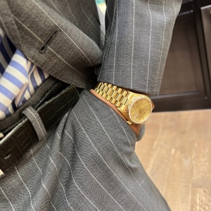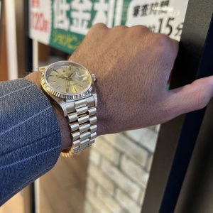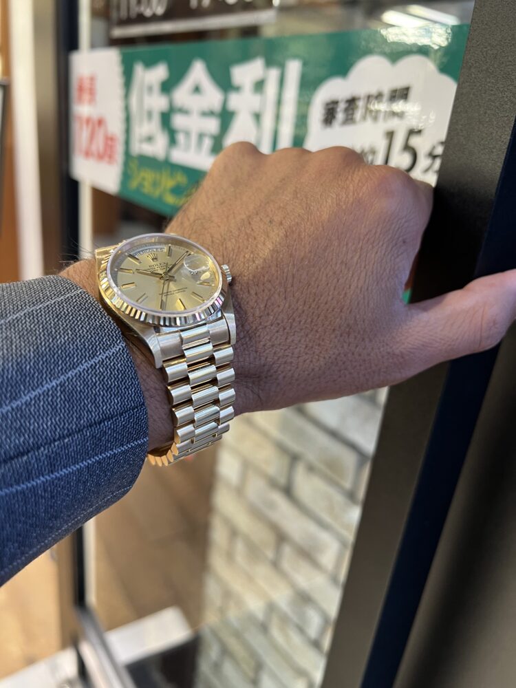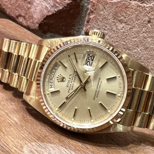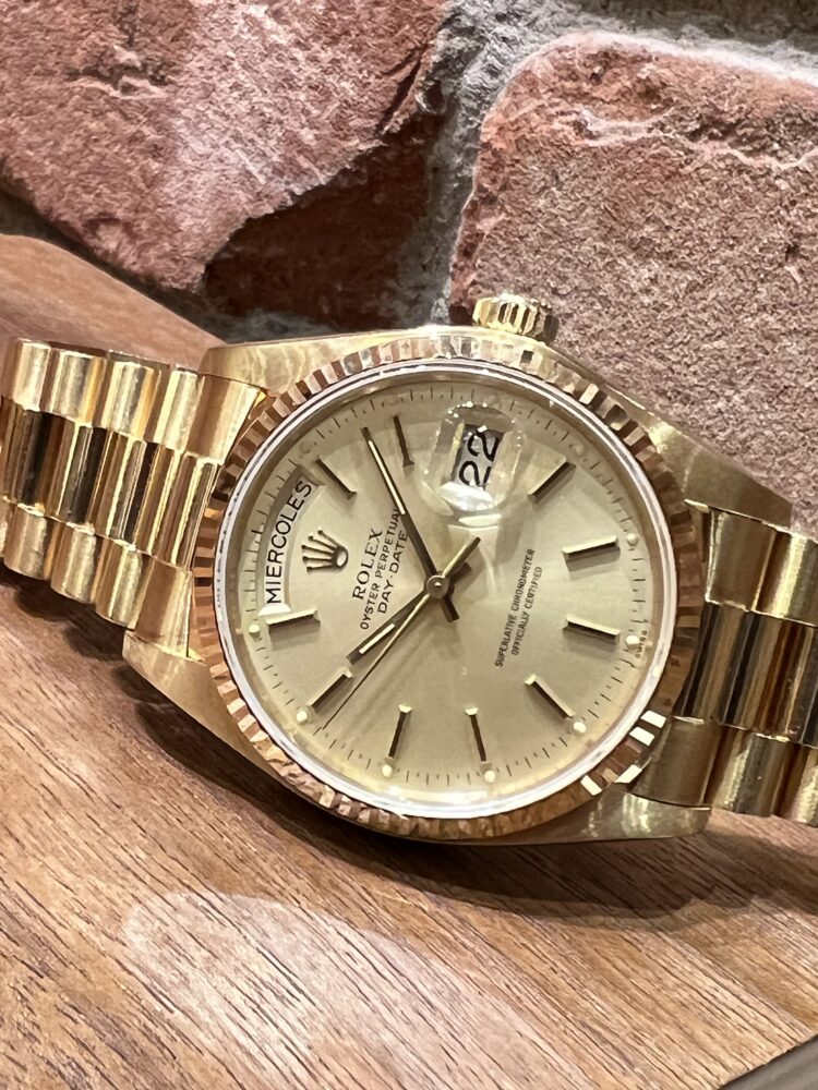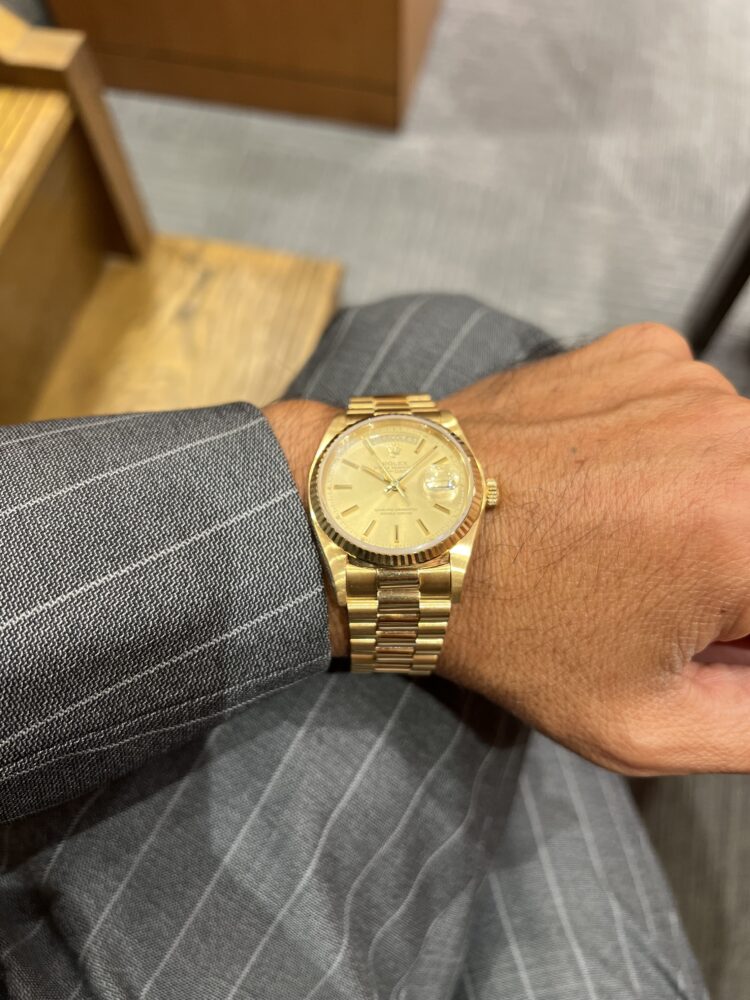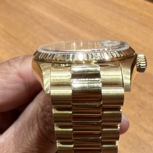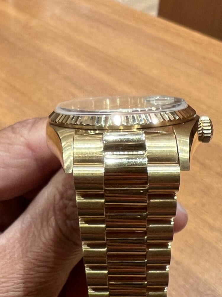 スタンダードモデルの最高峰クラスデイデイトです。3時位置にデイト(日付)12時位置にデイ(曜日)を備えております。素材は、オール18金イエローゴールドを採用していて、オーラが凄いですね。何とこちらのデイデイトはノンポリッシュで迫力のあるケースが魅力的です!