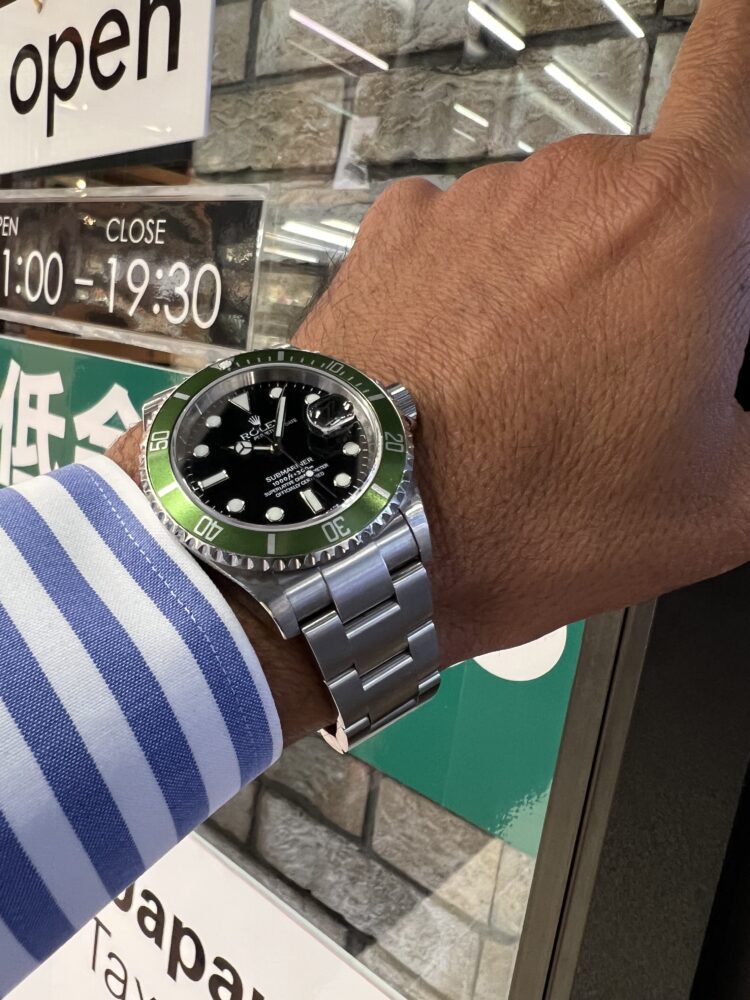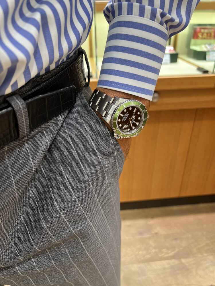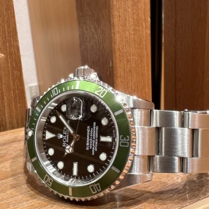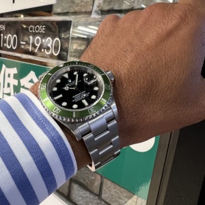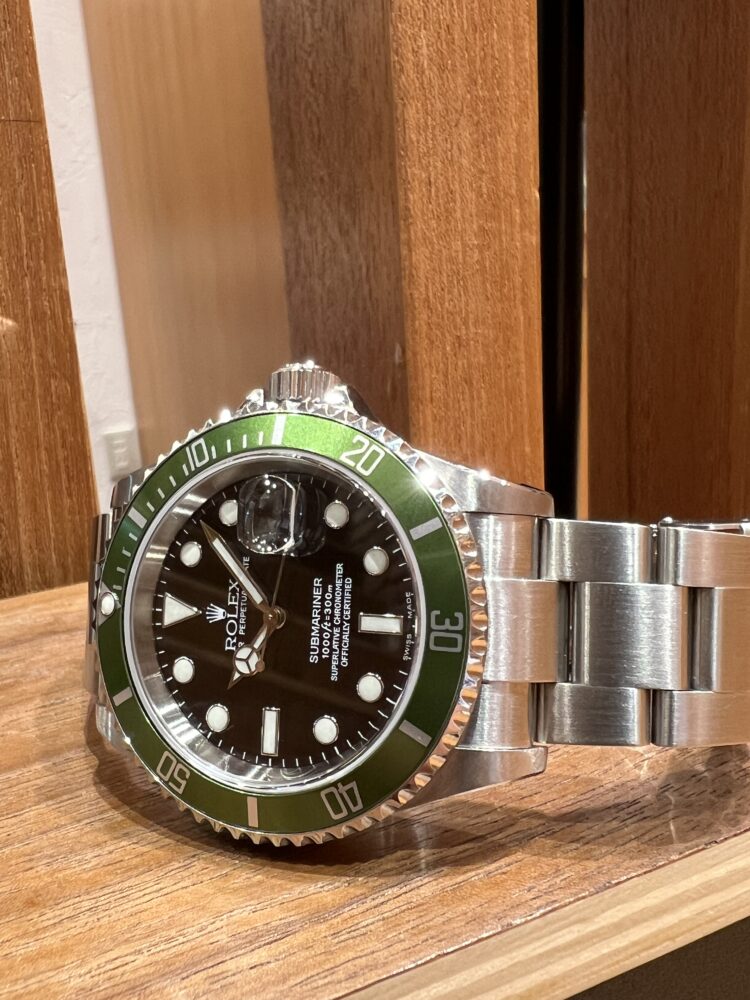 2003年にサブマリーナー生誕50周年を記念し発表された初代グリーンサブマリーナーRef.16610LV。その中でも特にレアな個体がこちら。ベゼルフラット4のダイヤルがワイドスイス表記にライムカラーのベゼルです。探してもなかなか見つからない1本ではないでしょうか。