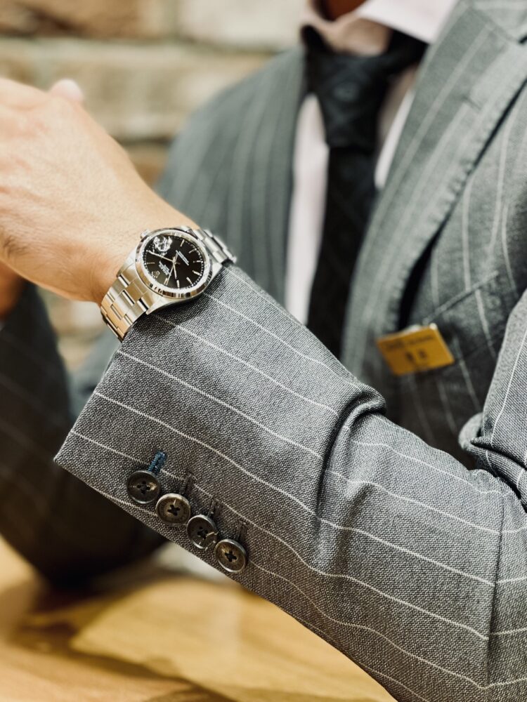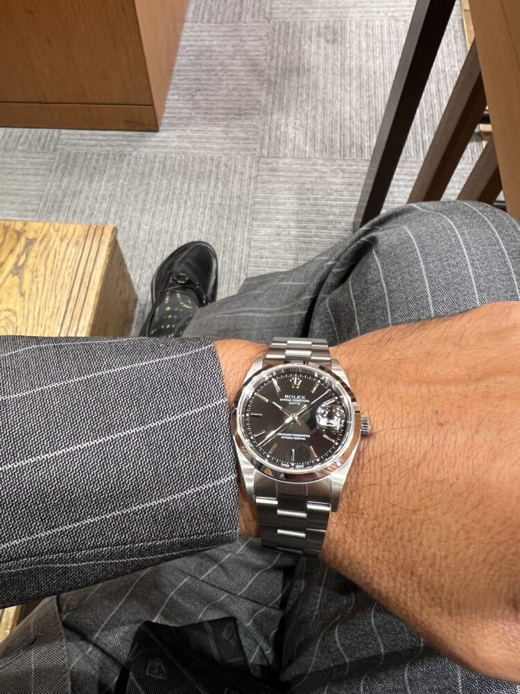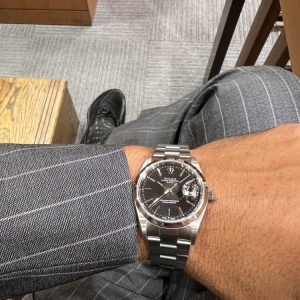 1990年代から2006年頃まで製造されたオイスターパーペチュアルデイトRef.15200です。シンプルなデザインに比較的小振りな34ミリケースが素敵なオイスターパーペチュアルデイト。ダイヤルは精悍なブラックで腕元を引き締めてくれます!リーズナブルな価格も魅力的ですね。