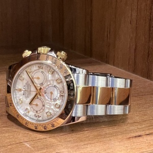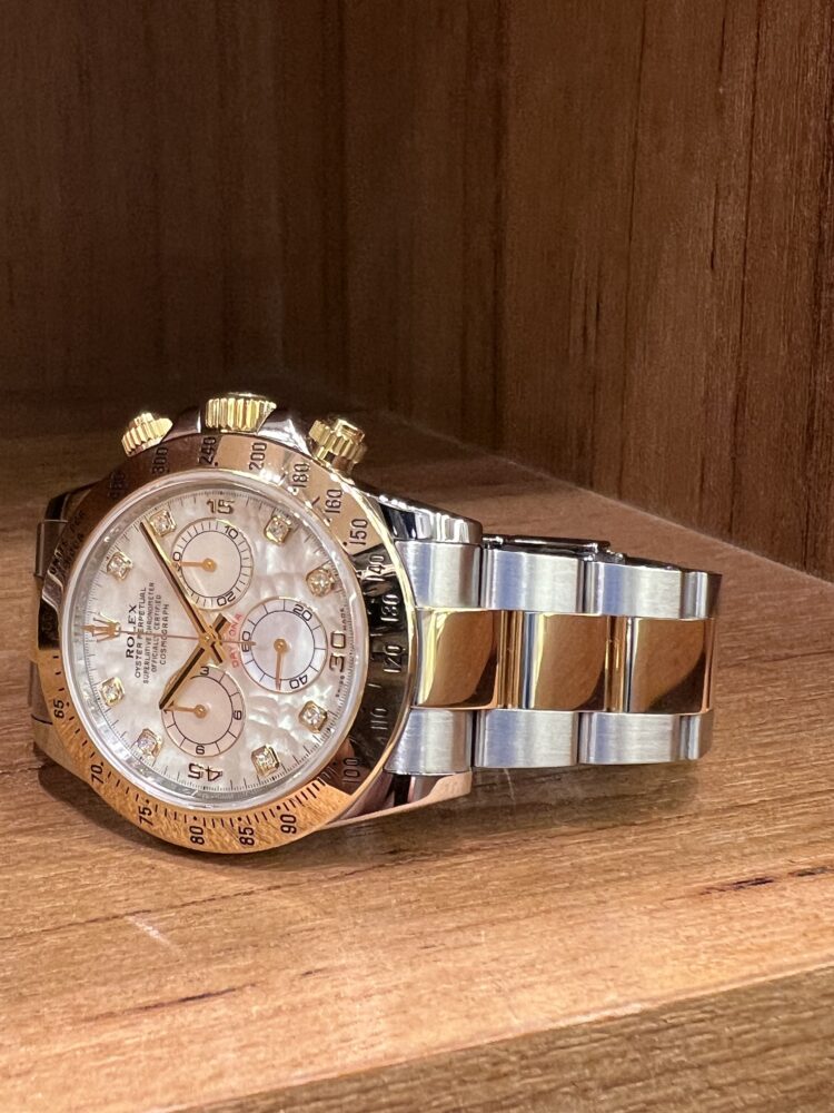 世界に一つだけのデイトナ 増田 シニアエキスパート クォーク神戸店 2026.02.02 2000年から2016年まで製造されていたデイトナRef.116523NG。ステンレスとイエローゴールドのコンビネーションが豪華な仕様です。ダイヤルにはマザーオブパール(白蝶貝)を使用しています。マザーオブパールは、光のあたり具合や角度によって見え方が変わってきます。また、同じ柄のデザインがないため世界に一つだけの雰囲気を楽しんで頂けます。 デイトナ 中古品 クォーク神戸店 このスタッフへ問い合わせる この商品の詳細はこちら