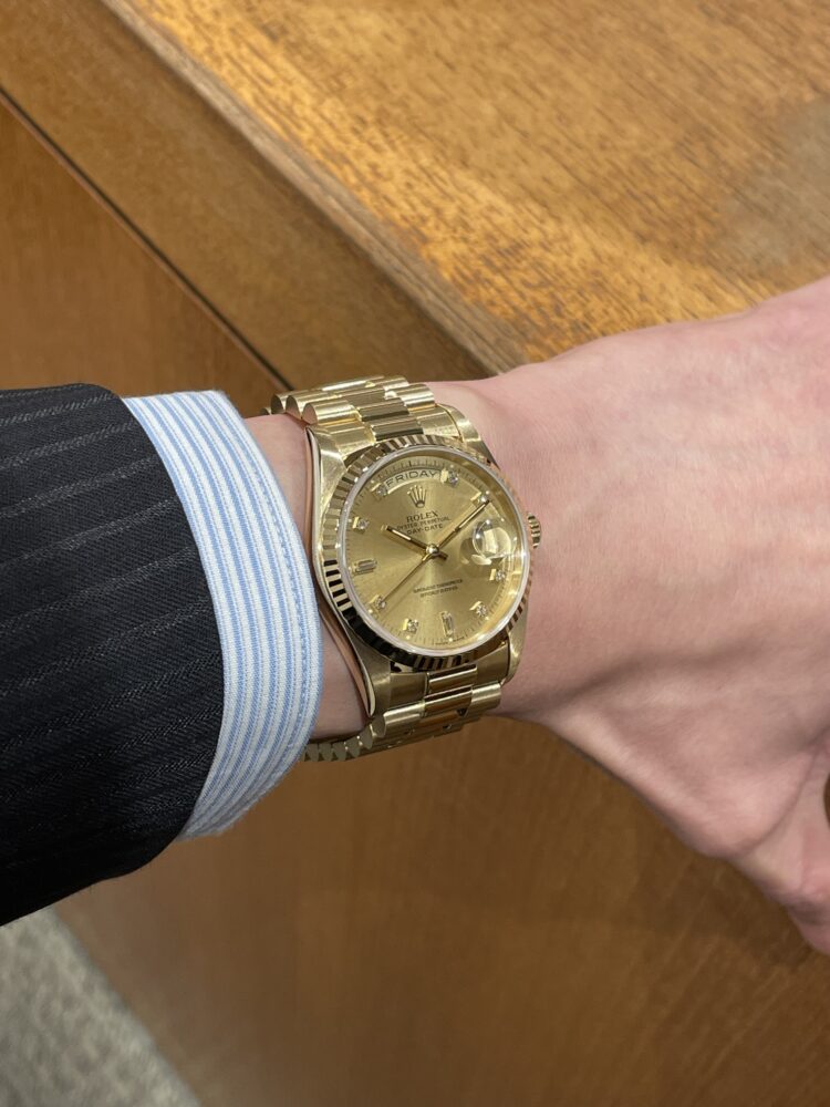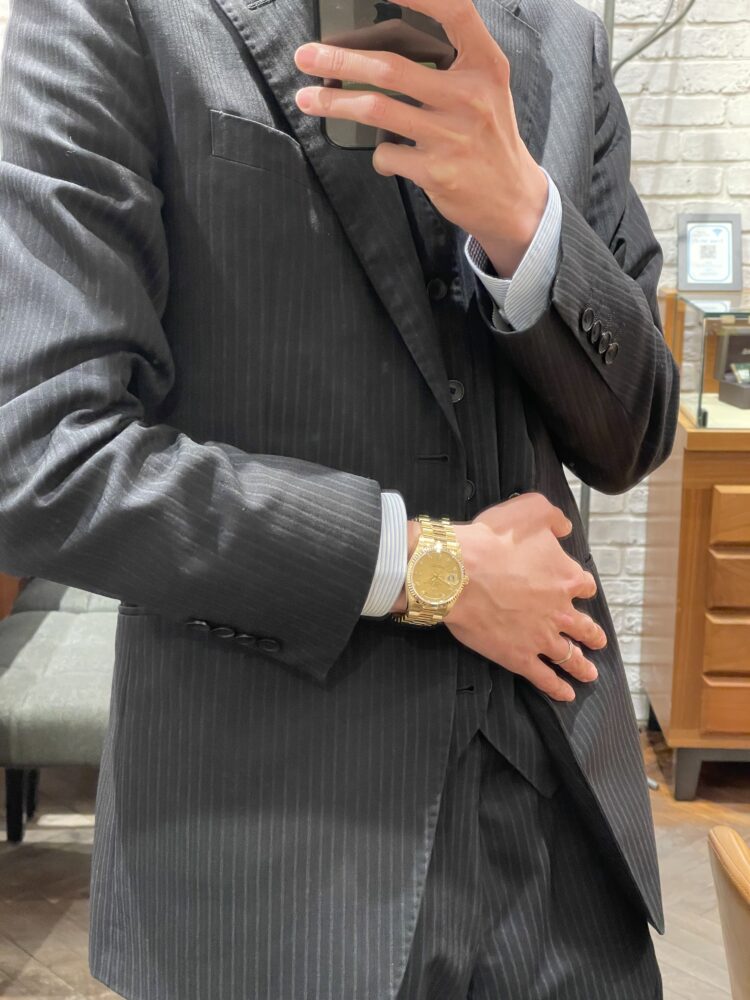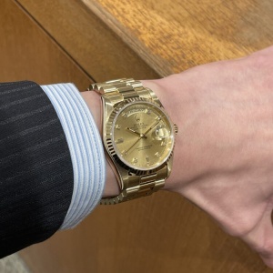 ワンランク上の高級感を 中村 クォーク心斎橋店 2026.03.15 本日は圧倒的存在感を放つ金無垢モデル【DAY-DATE Ref.18238A】をご紹介いたします! ゴールドやプラチナのレアマテリアルのみでモデル展開され、ロレックス最高峰モデルであるデイデイト! 日付表示に加えて曜日表示を備えており、高級感だけではなく実用性も抜群! イエローゴールド無垢でダイヤルには10個のダイヤモンドが配置されており、煌びやかに演出してくれます! 保証書が付属していない分比較的安価にお求めいただけます! 是非、腕元にどうぞ。 中古品 デイデイト クォーク心斎橋 このスタッフへ問い合わせる この商品の詳細はこちら