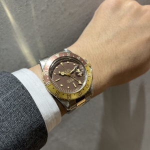 現行モデルの通称「カフェオレ」につながる、ブラウンカラーをデザインの主役に据えたGMTのうち、本モデルは2代目となります。