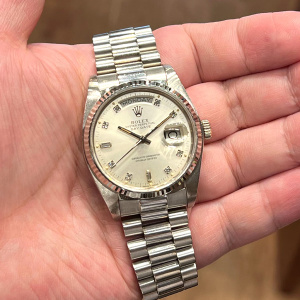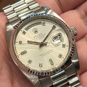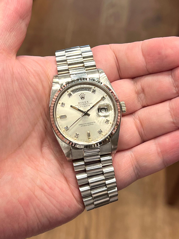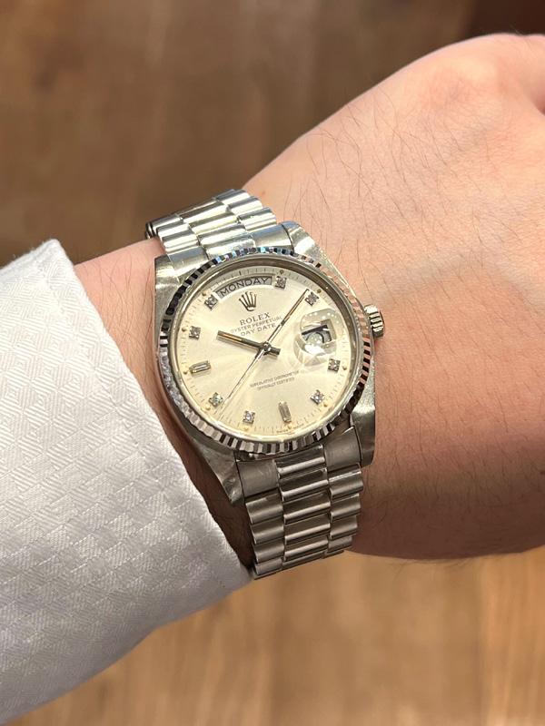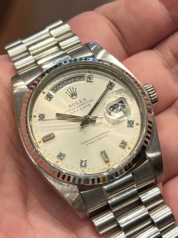 イエローゴールドよりも数が少ないと言われるホワイトゴールド製であることも魅力的ですが、こちらの個体に限りましては一層数が少ないダイヤ付きのダイヤルでございます。