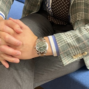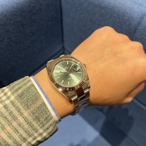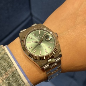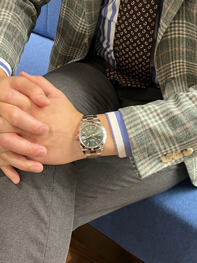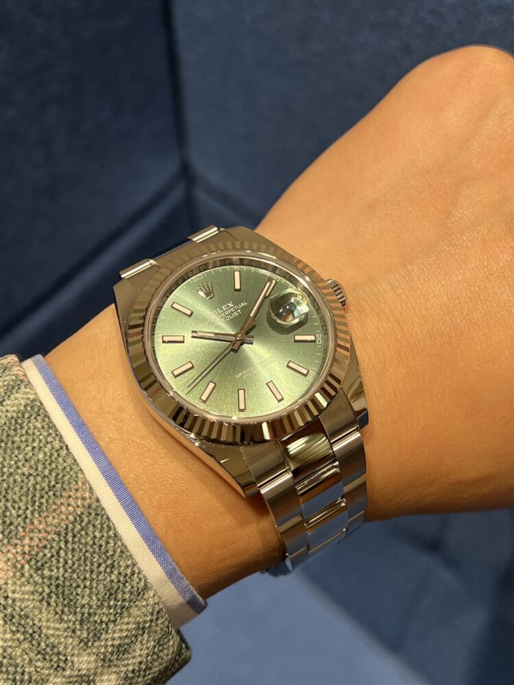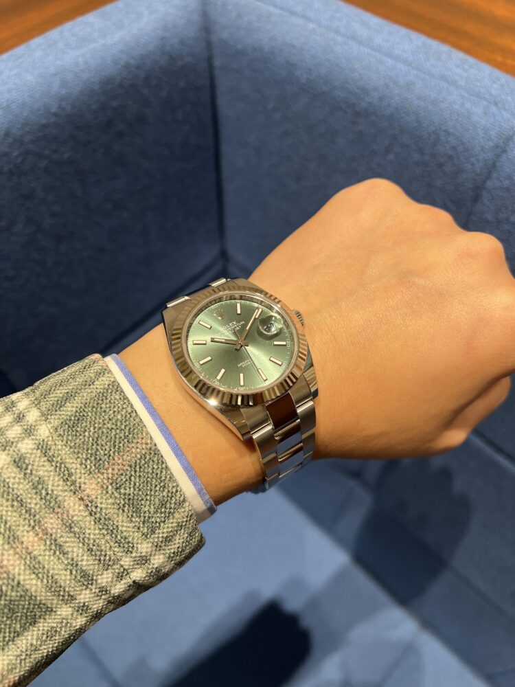 『グリーンにグリーン合わせてみました』 尾崎 店長 クォーク静岡店 2025.10.05 『グリーンにグリーン合わせてみました』 ROLEX DATEJUST41 Ref.126334(ミントグリーン) 本日はグリーンのジャケットを着ていたので、ミントグリーンを合わせてみました サンレイ仕上げが施してあり、光のあたる角度により濃淡が生まれ、非常に美しい文字盤です ケースサイズ41mm 尾崎腕回り16cm デイトジャスト クォーク静岡店 このスタッフへ問い合わせる この商品の詳細はこちら