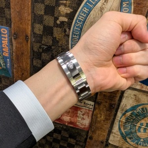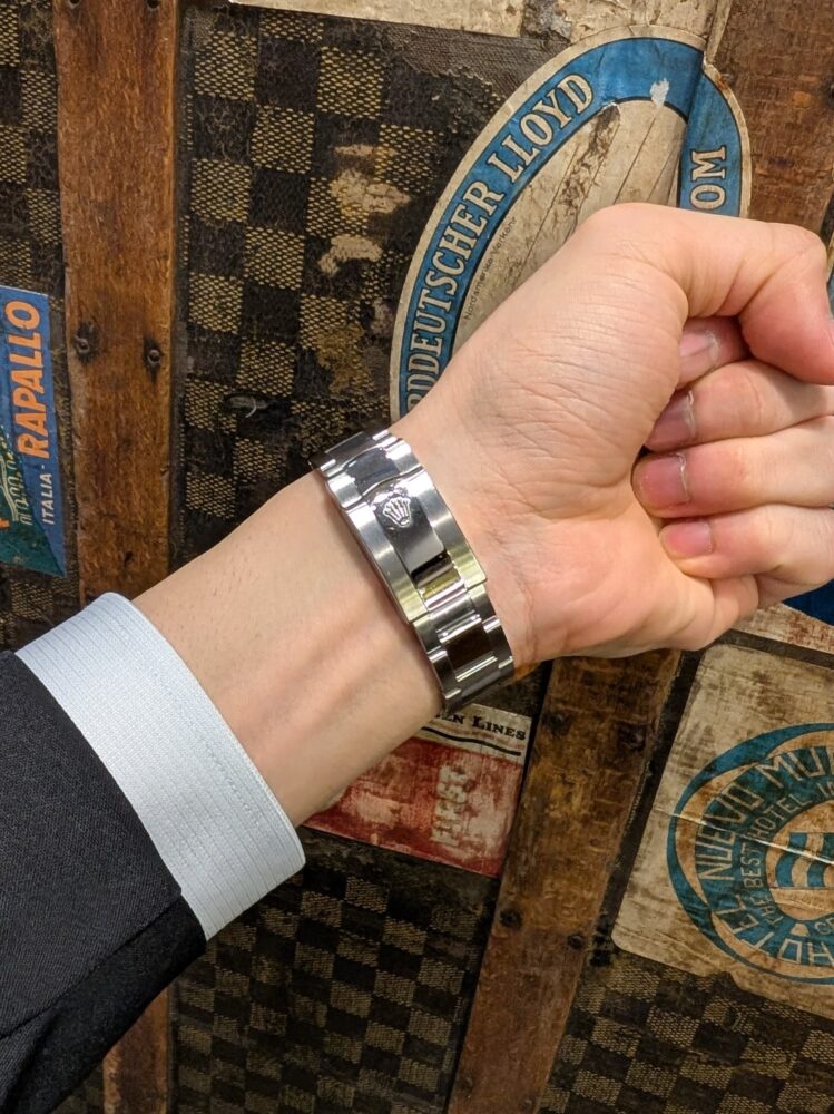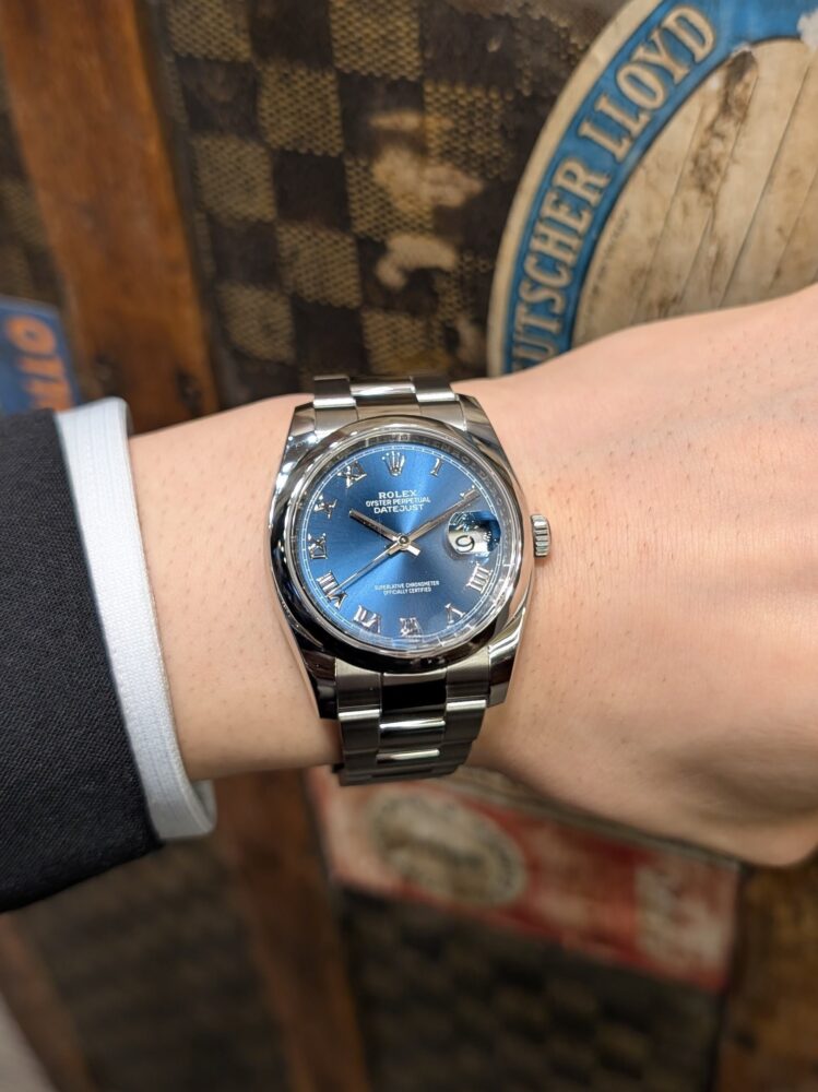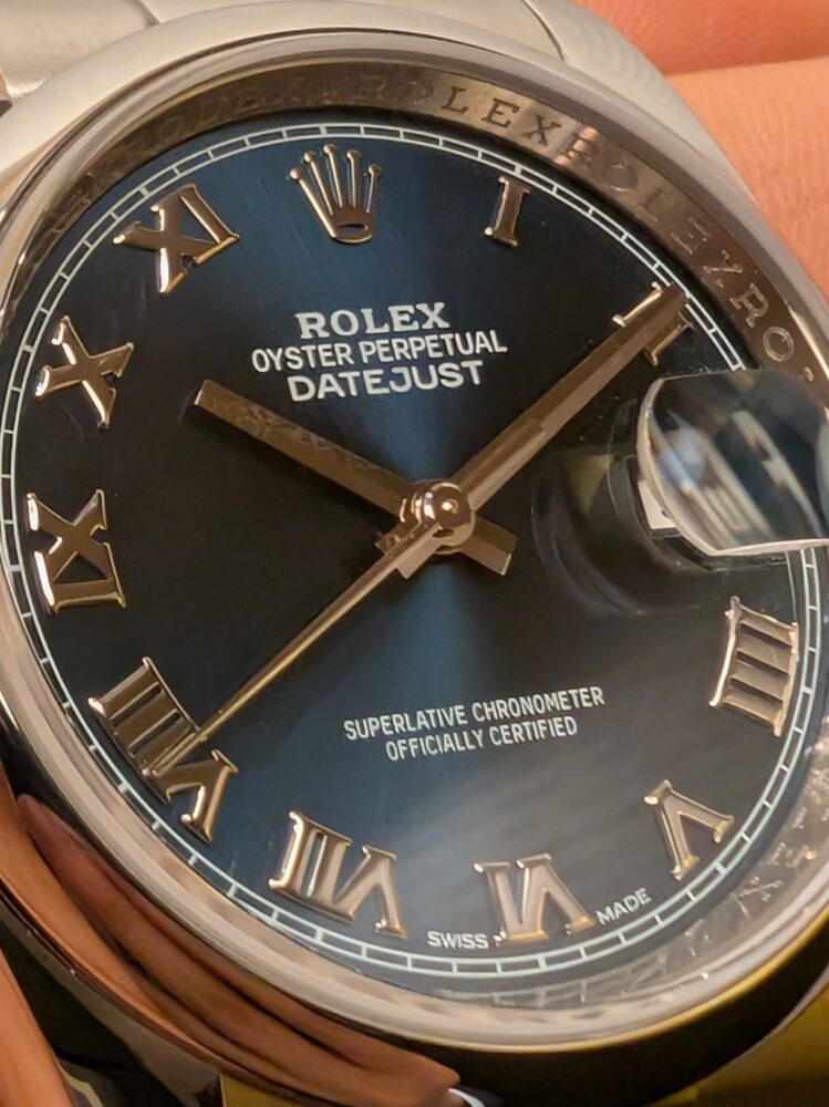 現行のデイトジャストでは41ミリモデルのみ販売されている青文字盤にローマ数字インデックスの組み合わせです。