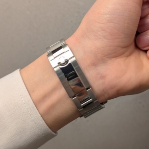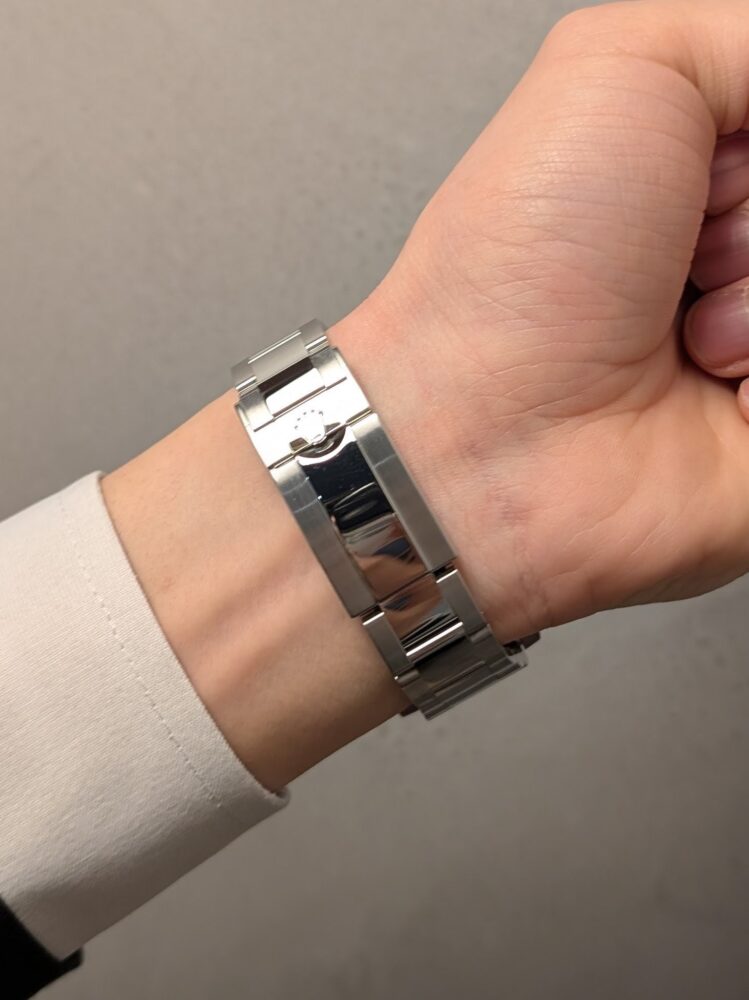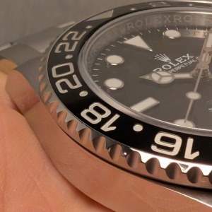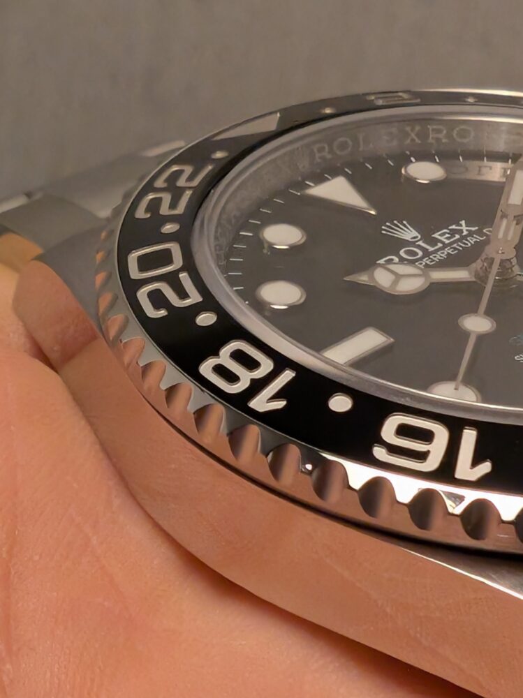 ツヤのある黒のセラミック製ベゼルが美しいのはもちろんですが、GMT針やモデル表記のロレックスらしいグリーンが大変良いアクセントになっています。