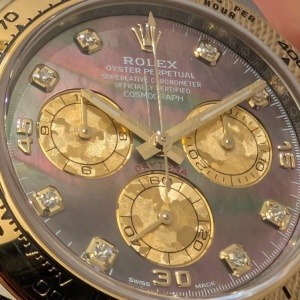 ブラックシェル文字盤は光の反射によって虹色に光りますので見るたびに違う表情を見せてくれる飽きの来ないダイアルです。