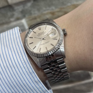 控えめなダイアルサイズにホワイトゴールド×ホワイトダイアルが映える爽やかな1本。モデル名に加えて秒針とカレンダー表記も同じく赤色で統一され、「DATEJUST」とはっきりと区別が付くデザインとなっております。人と差をつけるにはぴったりのモデルですね!製造期間は2004年~2013年頃と10年足らず。特にジュビリーブレスレット仕様は市場台数も少ない希少モデルです!