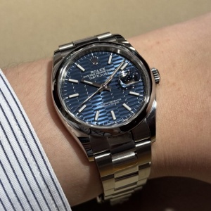ロレックスの永遠の定番「デイトジャスト36」に、2021年から加わった新たな表現がこちらのフルーテッドモチーフダイヤルです。サンレイ仕上げのブライトブルーをベースに、ブランドを象徴するフルーテッドベゼルの意匠をダイヤル上に繊細かつ立体的に再現。光が差し込む角度によってブルーの濃淡が変化し、腕元に豊かな陰影と深みをもたらします。