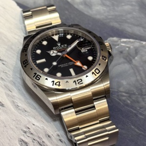 冒険家たちに愛され続けるエクスプローラーⅡの現行モデル、Ref.226570 ブラックダイヤル。42mmケースならではの力強い存在感と、ロレックスが誇る高い視認性が融合した、まさに“究極の実用時計”です。