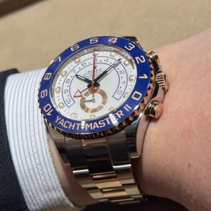 ホワイトダイヤルにブルーのカウントダウンスケール、ローズゴールドの針とインデックスが絶妙なコントラストを演出。スポーティさの中にロレックスらしい高級感をしっかり感じられる一本です。