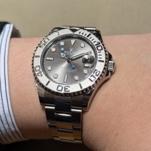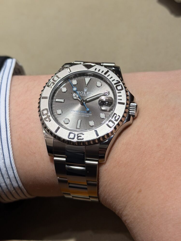 37mmケースは主張しすぎず、手元に自然に馴染む絶妙なサイズ感。ステンレススチール×プラチナ(ロレジウム)の組み合わせが生む、控えめながらも確かな高級感が魅力です。プラチナ製ベゼルの上質な輝きと、落ち着いたスレートダイヤルが相まって、カジュアルからジャケットスタイルまで幅広く対応。