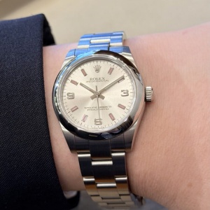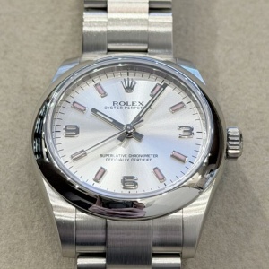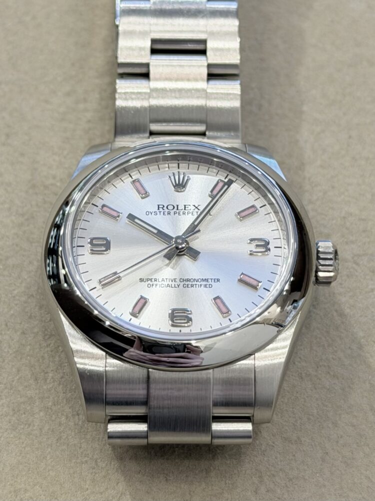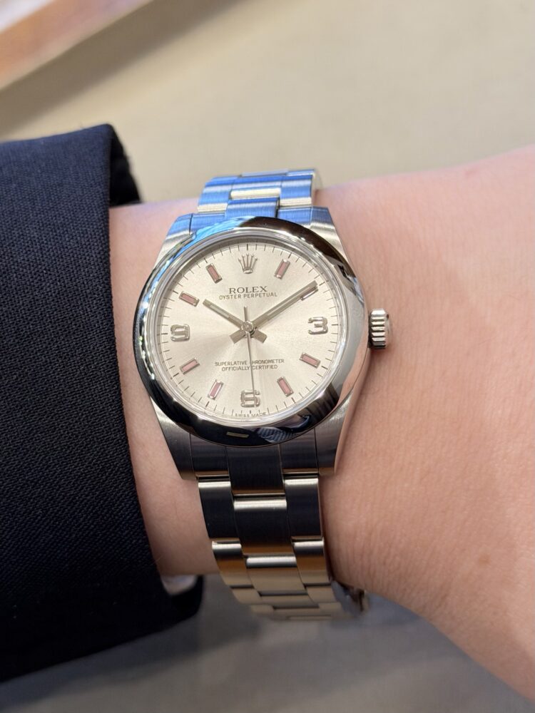ロレックスの中でも、上品さと実用性を兼ね備えた31mmケース。主張しすぎず、それでいて確かな存在感を放つ、絶妙なサイズバランスが魅力です。