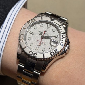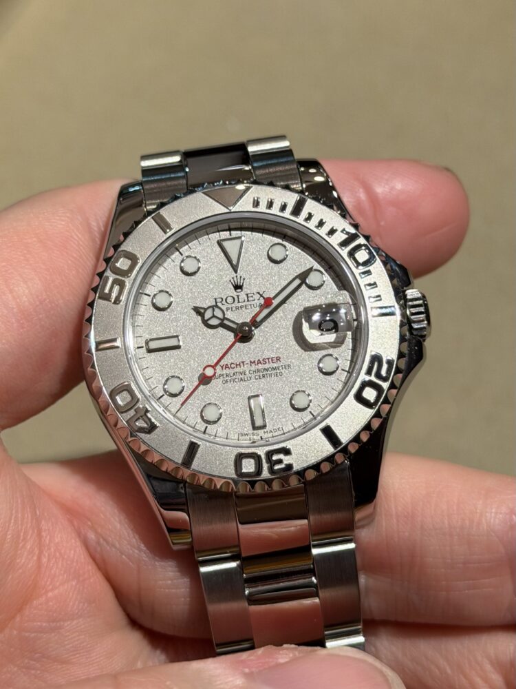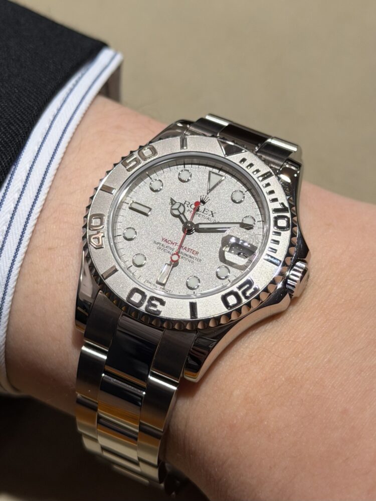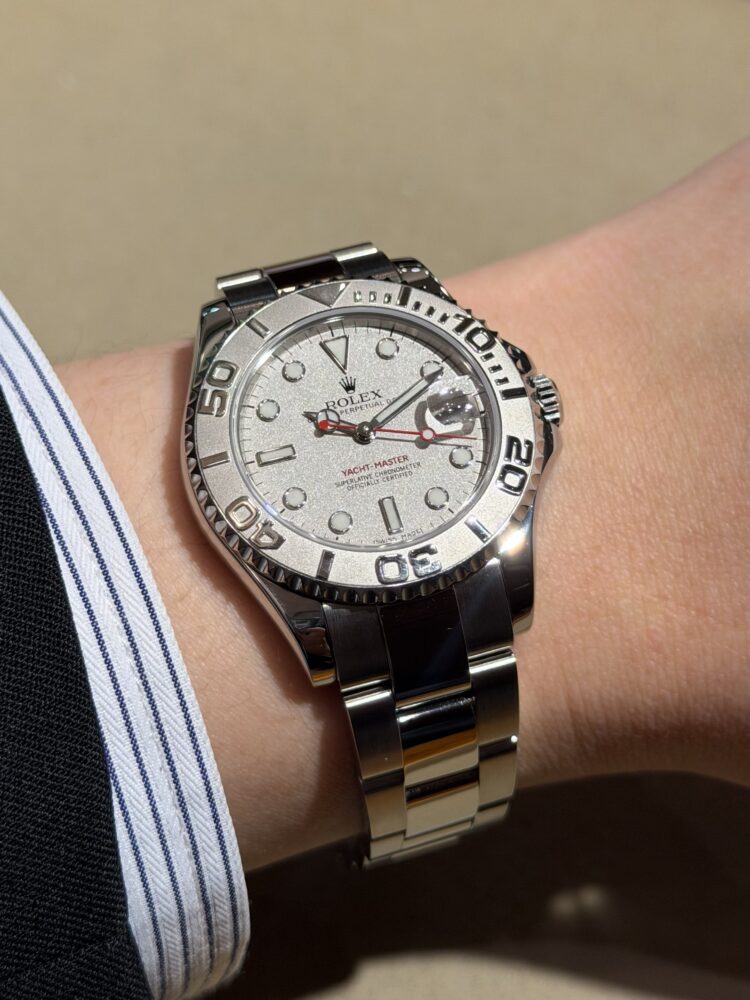 ステンレススチールケースに組み合わされるのは、プラチナ製ベゼル。光を受けて控えめに輝くその表情は、派手さではなく“上質さ”で語りかけてきます。近くで見るほどに違いが分かる、大人のためのディテール。