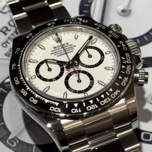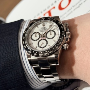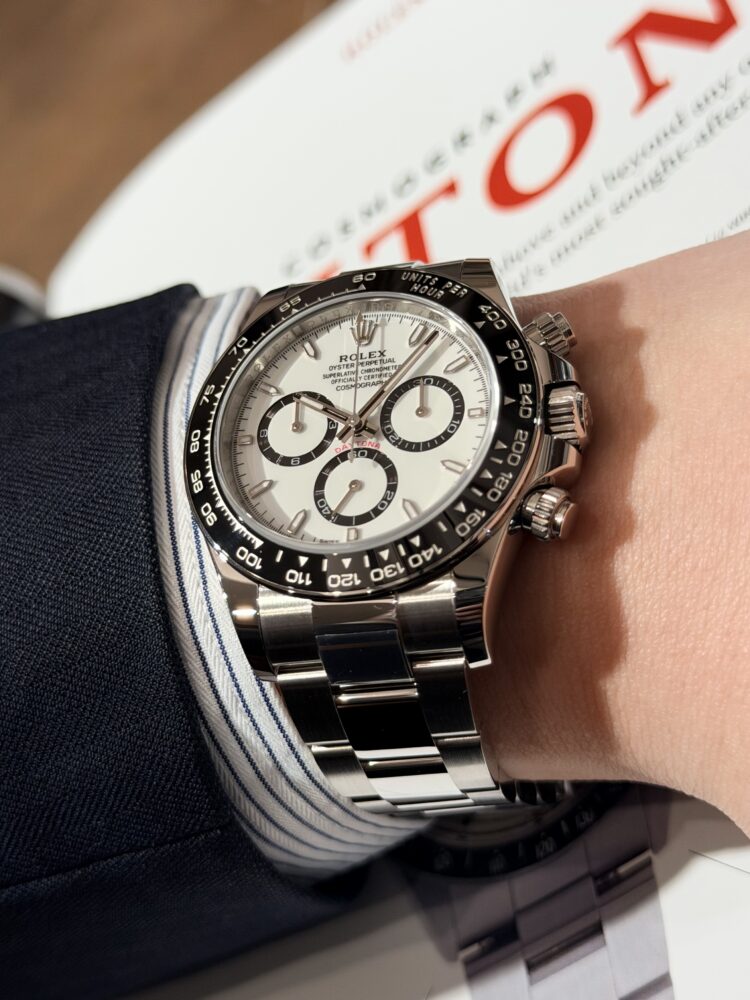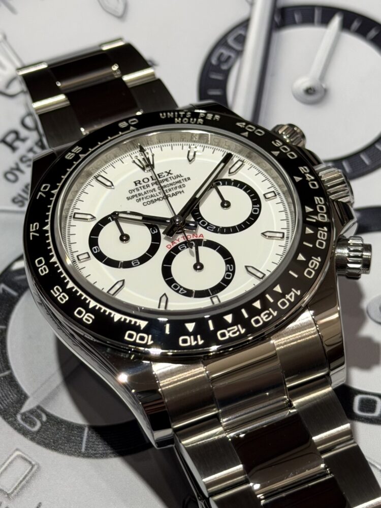 研ぎ澄まされたブラックベゼルと、眩いホワイトダイヤルのコントラスト。