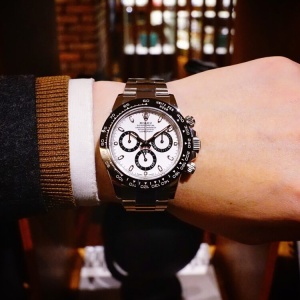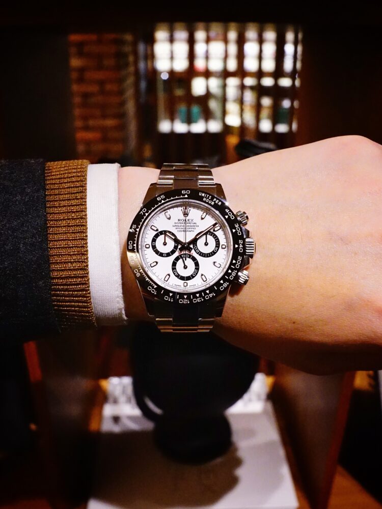 「パンダ」とも呼ばれる、ホワイトとブラックのコントラストが強調されたこのデザインは、腕元で存在感を放つ1本です。